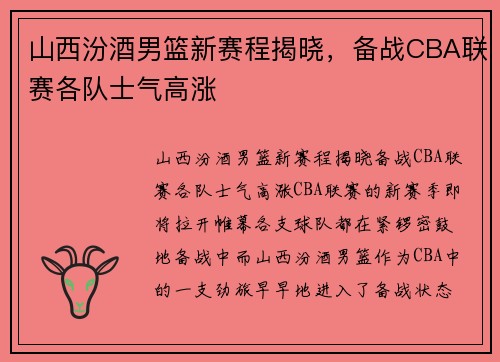 CBA联赛的新赛季即将拉开帷幕,各支球队都在紧锣密鼓地备战中。而山西汾酒男篮作为CBA中的一支劲旅,早早地进入了备战状态。近日,山西汾酒男篮的新赛程正式揭晓,这无疑让球迷们的期待达到了新的高度。